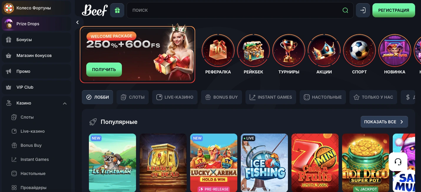 Казино криптовалюта Beef. Ліцензія та рік запуску: сучасний бренд з ліцензією Кюрасао (деталі залежать від конкретного сайту-дзеркала), активний у 2020-х роках. Підтримувані криптовалюти: Bitcoin, Ethereum та інші основні криптовалюти плюс класичні методи (Visa, Mastercard, банківські перекази). Основні бонуси: вітальний бонус (наприклад, відсоток до депозиту), акції на слоти та live, фріспіни; умови залежать від регіону й поточної промо-кампанії.
