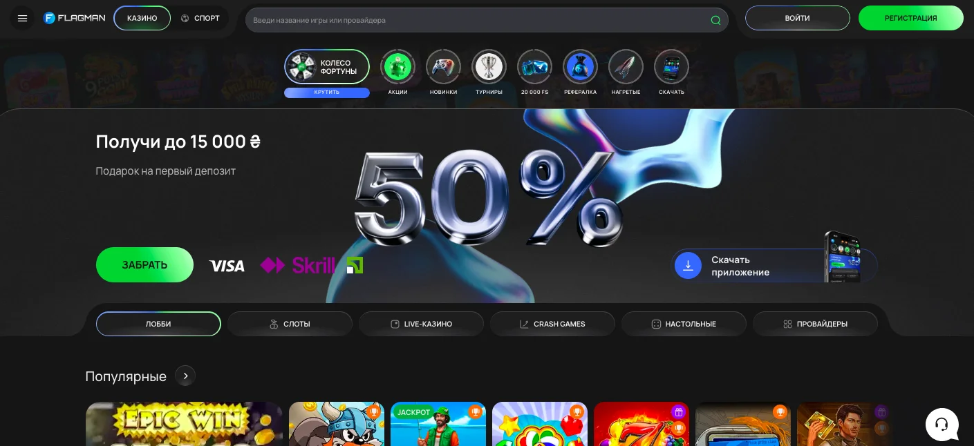 Онлайн казино крипта Flagman. Ліцензія та рік запуску: крипто-орієнтований сайт із ліцензією Кюрасао, активний з середини 2020-х. Підтримувані криптовалюти: Bitcoin, Ethereum, Litecoin, Tether (USDT) як основні валюти для депозитів і виведення. Основні бонуси: багаторівневі вітальні пропозиції для криптодепозитів, регулярні акції, турніри, кешбек і VIP-програма (конкретні цифри залежать від поточної промо).